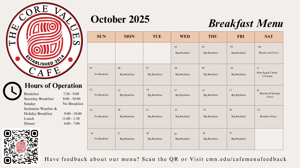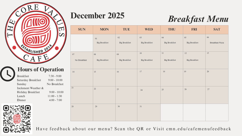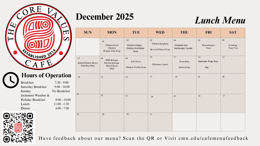 Located in the Student Center, The Core Values Cafe offers nutritious, affordably priced meals and beverages. Dining is available seven days a week, Monday through Sunday, except during campus breaks. During these times, when students are required to vacate student housing, dining services may be unavailable. This includes breaks such as Christmas, Thanksgiving, term breaks, and other scheduled breaks as indicated in the class schedule.