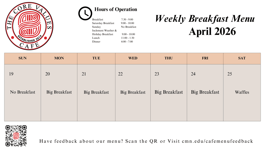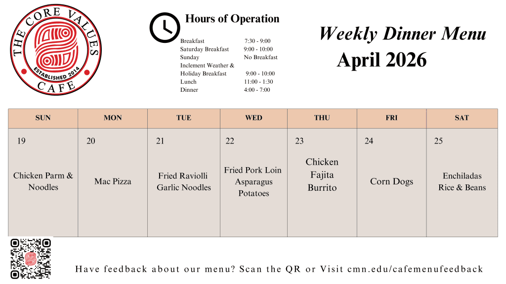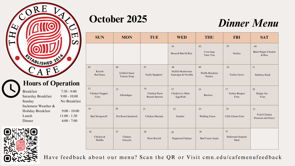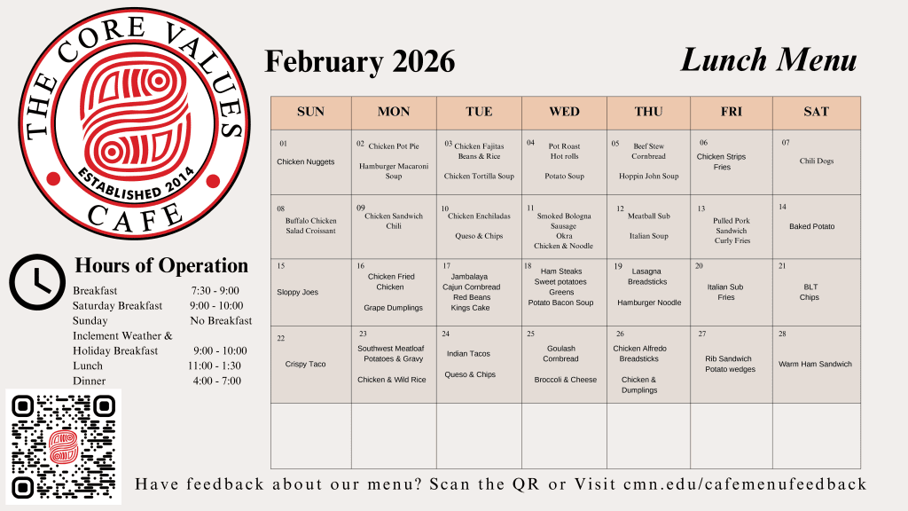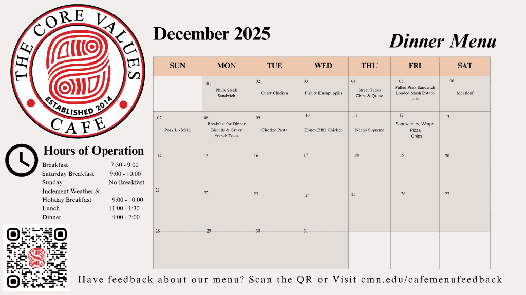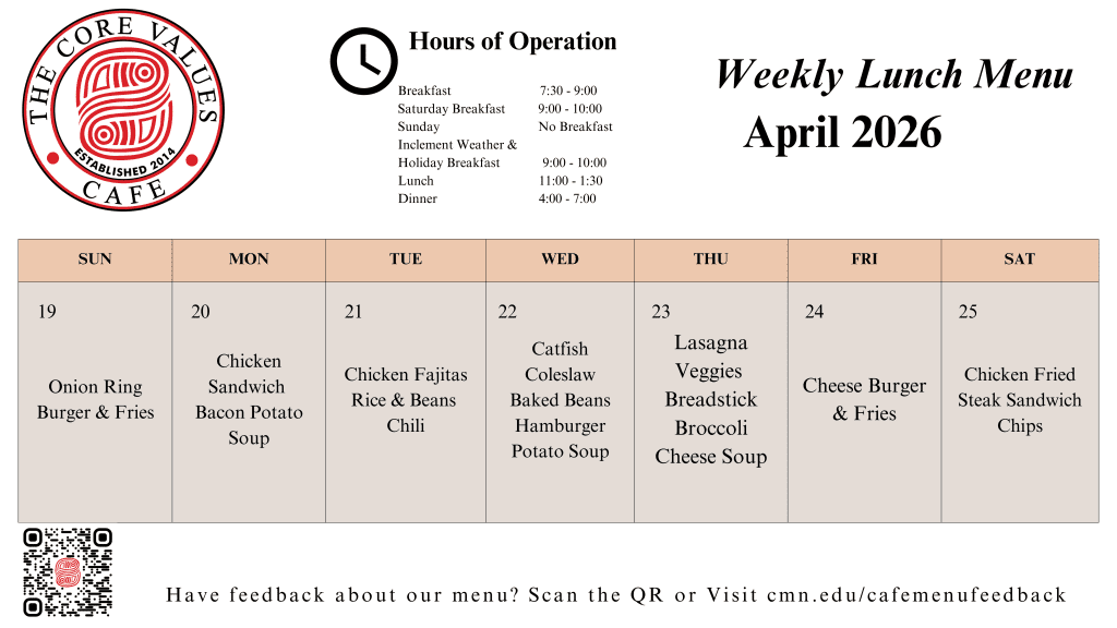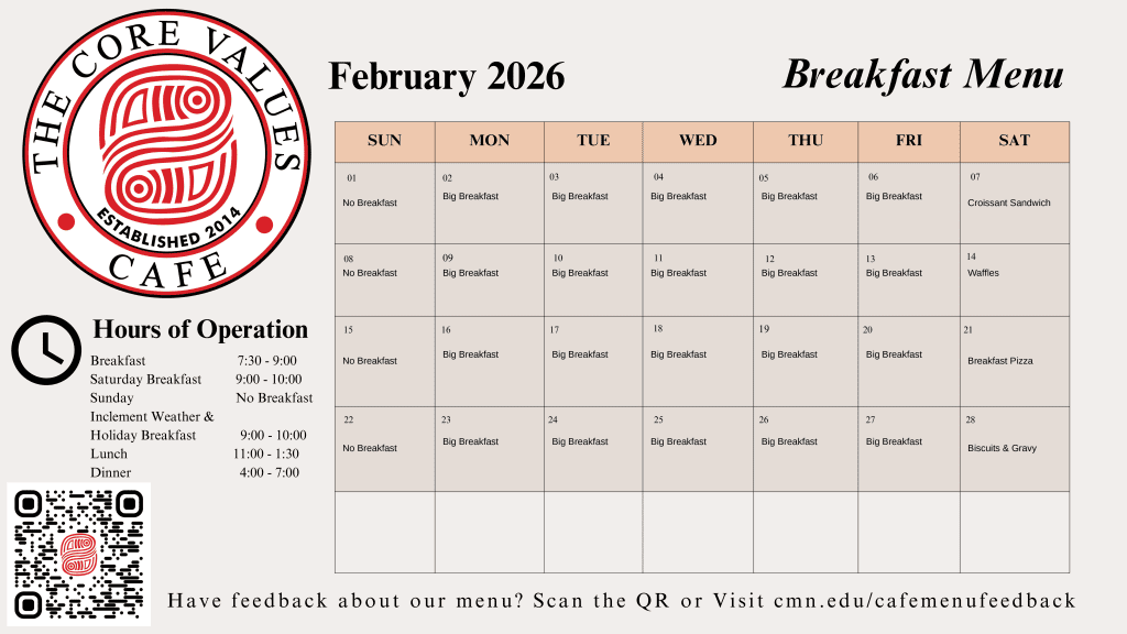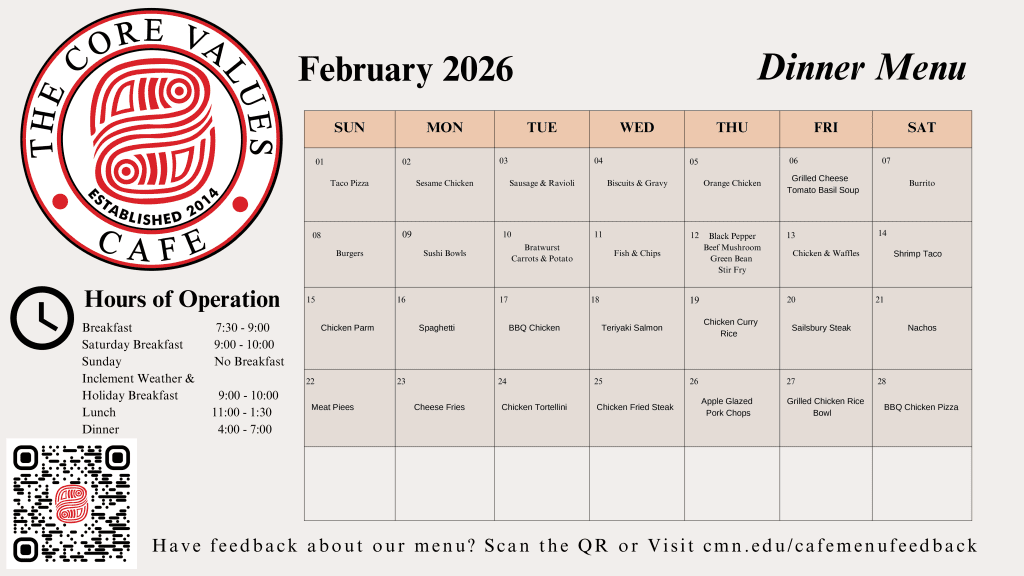 The Core Values Café is open for dining to non-residential students, visitors, faculty and staff. Cash, student meal card and credit cards are accepted.